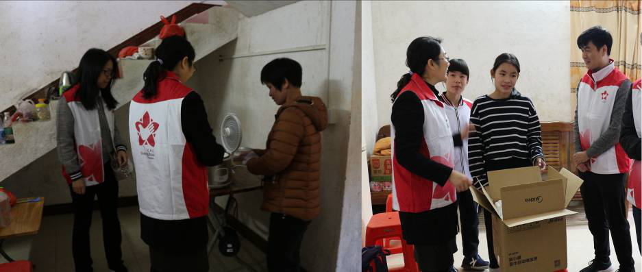 【志愿者们来到社区慰问单亲母亲困难家庭,为一家三口送上节日的慰问和祝福】