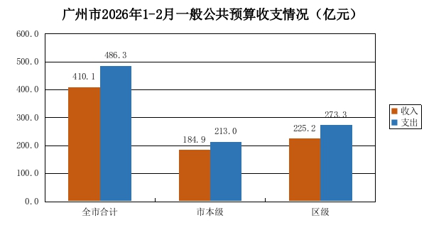 2026年1-2月,全市一般公共预算收入410.1亿元,可比增长1.8%(剔除省以下财政体制调整影响后的可比增幅,下同)。其中:市本级一般公共预算收入184.9亿元,可比下降0.9%;区级一般公共预算收入225.2亿元,可比增长4%。