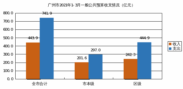2021年1-3月,全市一般公共预算收入443.9亿元,同比增长12.6%。其中:市本级收入201.6亿元,同比增长13.6%;区级收入242.3亿元,同比增长11.8%。全市一般公共预算支出741.9亿元,同比增长30.5%。其中:市本级支出297亿元,同比增长44.1%;区级支出444.9亿元,同比增长22.8%。