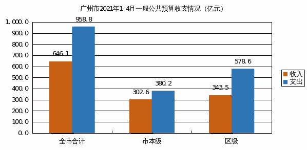 2021年1-4月,全市一般公共预算收入646.1亿元,同比增长20.2%。其中:市本级收入302.6亿元,同比增长18.1%;区级收入343.5亿元,同比增长22.1%。全市一般公共预算支出958.8亿元,同比增长11.5%。其中:市本级支出380.2亿元,同比增长11.2%;区级支出578.6亿元,同比增长11.7%。