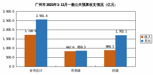 2021年1-11月,全市一般公共预算收入1,728.9亿元,同比增长11.6%。其中:市本级收入842.6亿元,同比增长13.7%;区级收入886.3亿元,同比增长9.7%。全市一般公共预算支出2,561.4亿元,完成年初预算94.6%,同比下降2.1%。其中:市本级支出859.3亿元,同比下降3.8%;区级支出1,702.1亿元,同比下降1.2%。