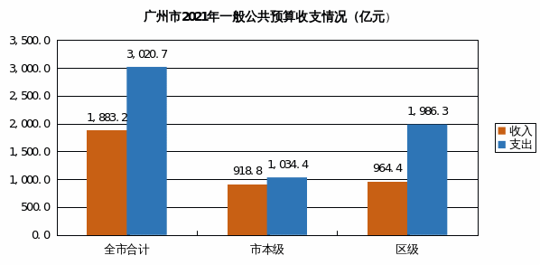 2021年,全市一般公共预算收入1,883.2亿元,完成年初预算105.6%,同比增长9.4%。其中:市本级收入918.8亿元,同比增长12.7%;区级收入964.4亿元,同比增长6.4%。全市一般公共预算支出3,020.7亿元,完成年初预算111.6%,同比增长2.3%。其中:市本级支出1,034.4亿元,同比增长3.4%;区级支出1,986.3亿元,同比增长1.8%。