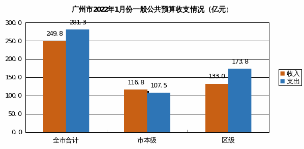2022年1月份,全市一般公共预算收入249.8亿元,同比增长4.9%。其中:市本级收入116.8亿元,同比增长12.5%;区级收入133亿元,同比下降1%。全市一般公共预算支出281.3亿元,同比增长21.2%。其中:市本级支出107.5亿元,同比增长9.7%;区级支出173.8亿元,同比增长29.6%。