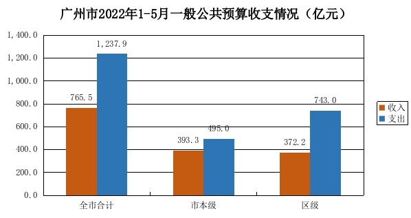 1-5月,全市一般公共预算收入765.5亿元,完成年初预算39.6%,扣除留抵退税因素后增长6.5%,按自然口径计算下降1.7%。其中:市本级收入393.3亿元,扣除留抵退税因素后增长15.1%,按自然口径计算同比增长6.4%;区级收入372.2亿元,扣除留抵退税因素后下降1.3%,按自然口径计算同比下降9%。全市一般公共预算支出1,237.9亿元,完成年初预算的42.6%,同比增长8.4%。其中:市本级支出495亿元,同比增长13.5%;区级支出742.9亿元,同比增长5.2%。